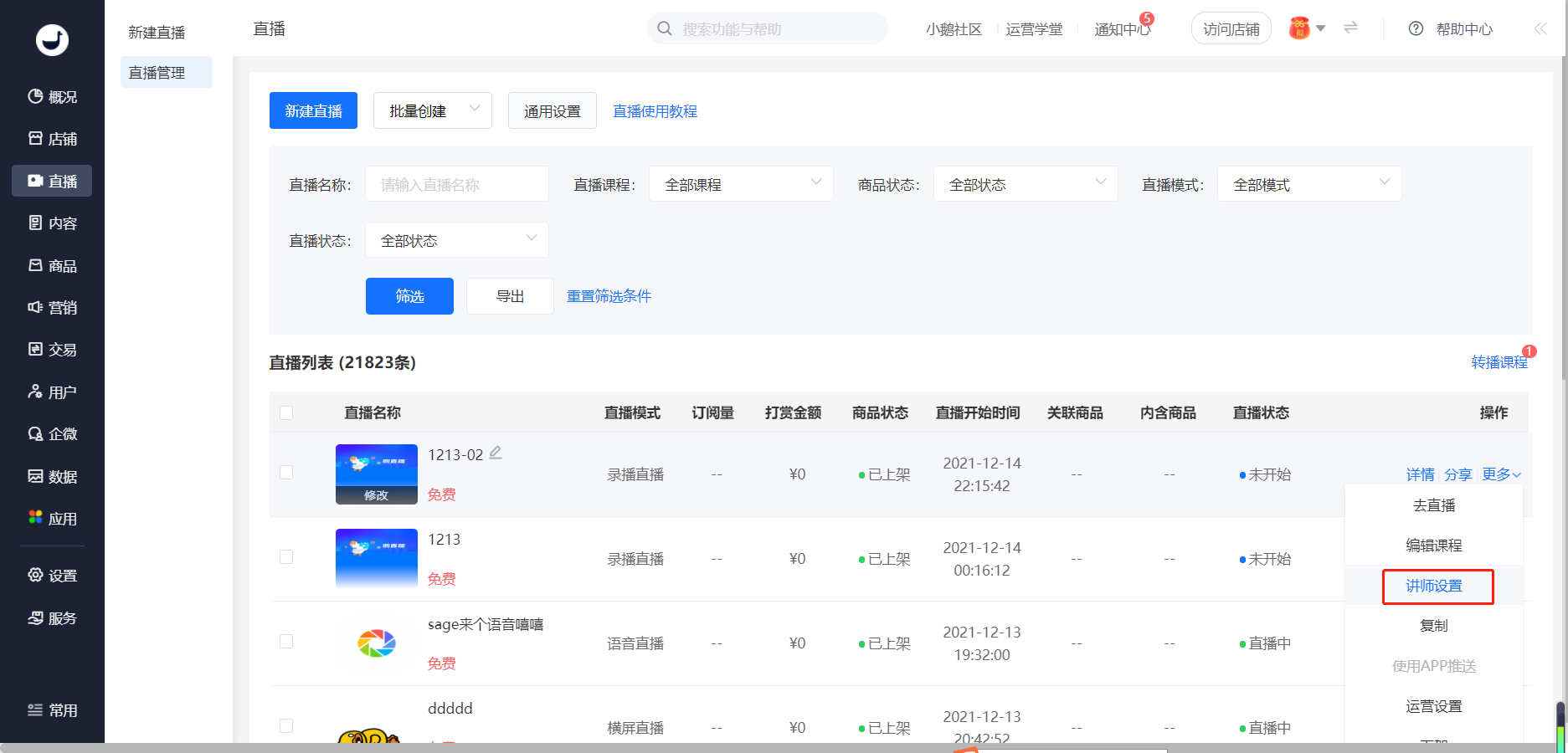 ● 操作路径:管理台—直播—直播列表—选择需要进行的直播—更多—讲师设置