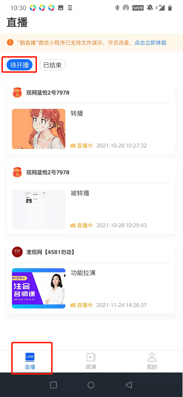 3、 在鹅学习APP中选择需要进行的直播课程,进入直播间开启直播